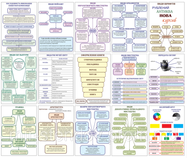 Комплект плакатів для кабінету мистецтв складається з 15 штук і відображає наступні теми:
