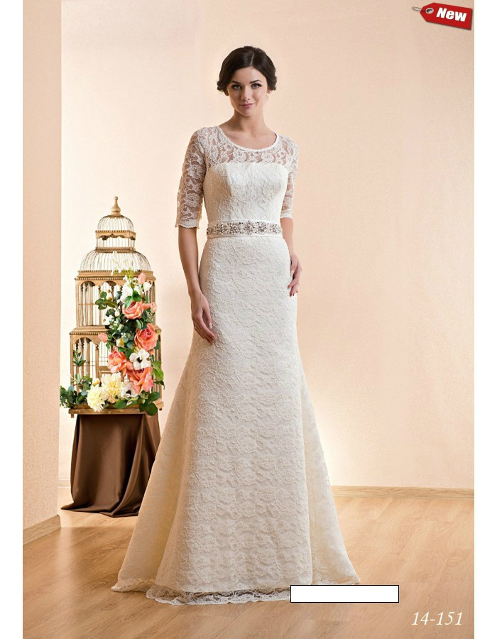 Свадебное платье Модель 14-151. Кружевное нежное свадебное платье со съемным фатиновым шлейфом. Рукавчик гипюровый прозрачный 3/4. Платье украшает пояс со стразовым орнаментом.