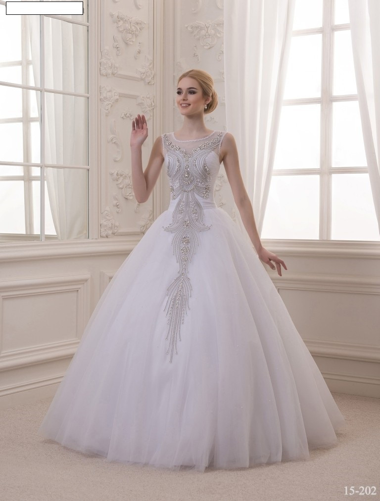 Свадебное платье Модель 15-202. Фатиновое пышное платье украшенное футуристической аппликацией, спускающейся с корсета на юбку. Аппликация украшена камнями и жемчужинами. Корсет выполнен в форме маечки. Платье шьется в двух цветах: белый и айвори.