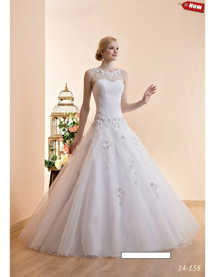 Свадебное платье Модель 14-158. Свадебное платье А-силуэта украшенное аппликацией дорогого кружева с цветами по корсету и юбке.