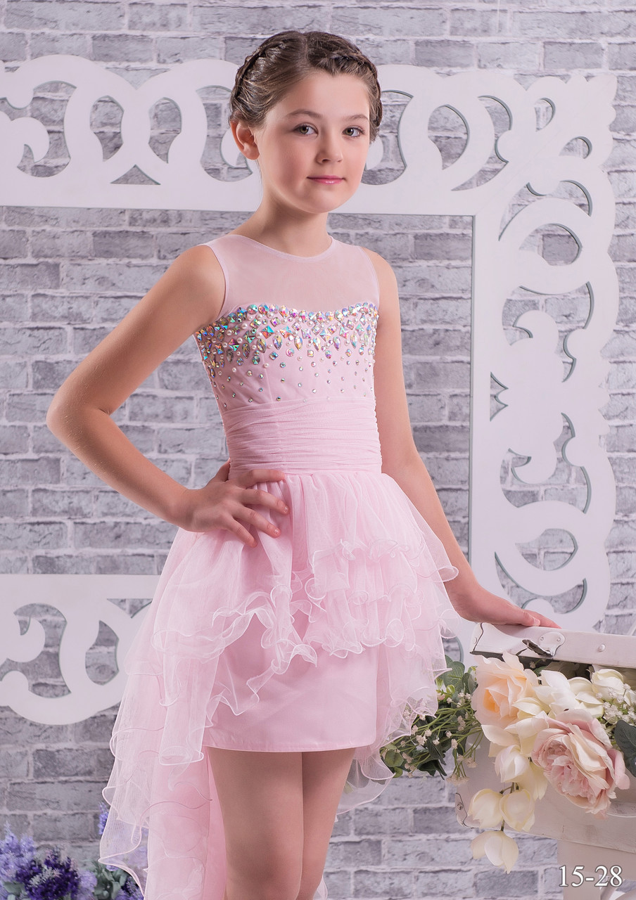 Детское платье 15-28. Модное детское платье со шлейфом из мягкой, струящейся ткани роскошными воланами. Корсет - маечкой, украшен по лифу стразками. Платье сзади затягивается корсетной шнуровочкой.