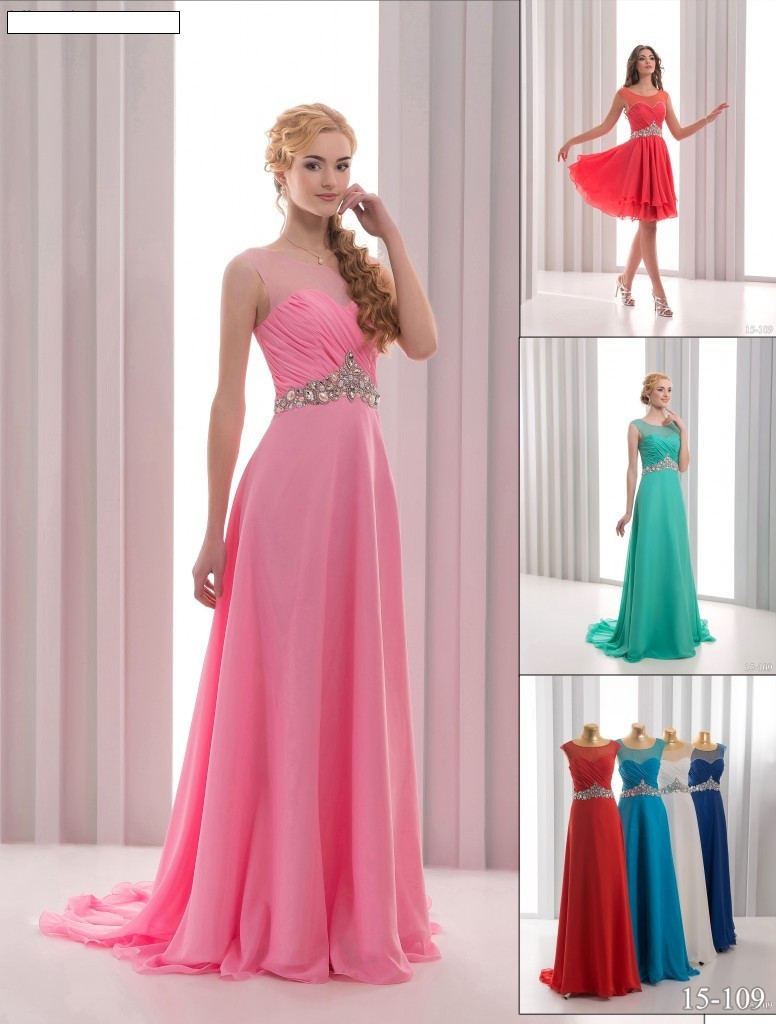 Вечернее платье 15-109. Нежное шифоновое вечернее платье в пол украшенное стразовым рисунком в виде короны по талии. Корсет сделан "маечкой" из прозрачной сетки. Лиф - сердечком нежно задрапированный шифоном. Вечернее платье со шлейфом