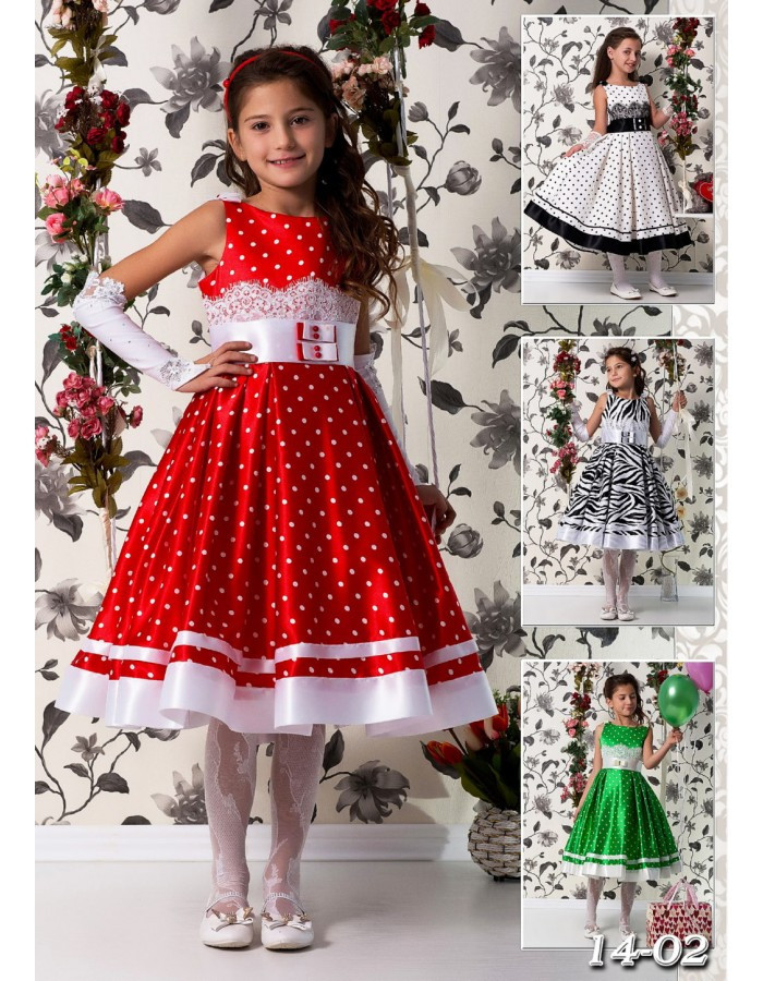 Детские платье Модель 14-02. Прекрасное детское платье в горошек. Лиф украшен кружевной вставкой и атласным пояском с двумя бантиками. Так же модель украшена маленькими бантиками по плечам. Юбка сама по себе пышная, так как идёт с вшитым подъюбником из жесткого фатина. Сзади платье завязывается поясом на бант. Платье с потайной змейкой без корсетной шнуровки.