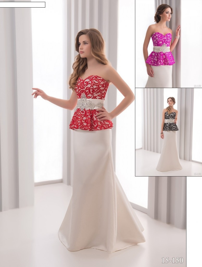 Вечернее платье 15-150. Длинное вечернее платье в пол по фигуре. Корсет затянут гипюром и удлинен в коротенькую верхнюю юбочку. Платье украшает широкий пояс со стразовым орнаментом.