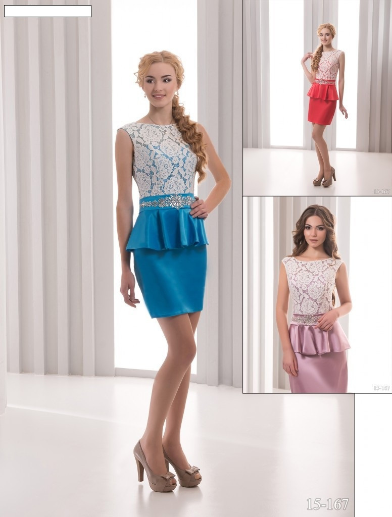 Вечернее платье 15-167. Короткое вечернее платье по фигуре созданное нежным атласом. Корсет - маечкой затянут гипюром с флористическим узором. Платье украшает пояс со стразовым орнаментом. Юбка двухуровневая. Собранная воланами верхняя честь юбки прекрасно дополняет узкую юбку-мини. Короткие вечерние платья