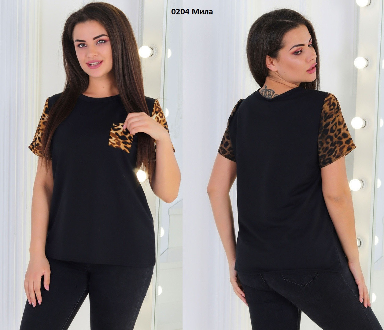 Футболка Лео рукава 0204 материал - двухнитка, вставки крепшифона, длина 65см цвет черный Размеры: 48-52, 54-58