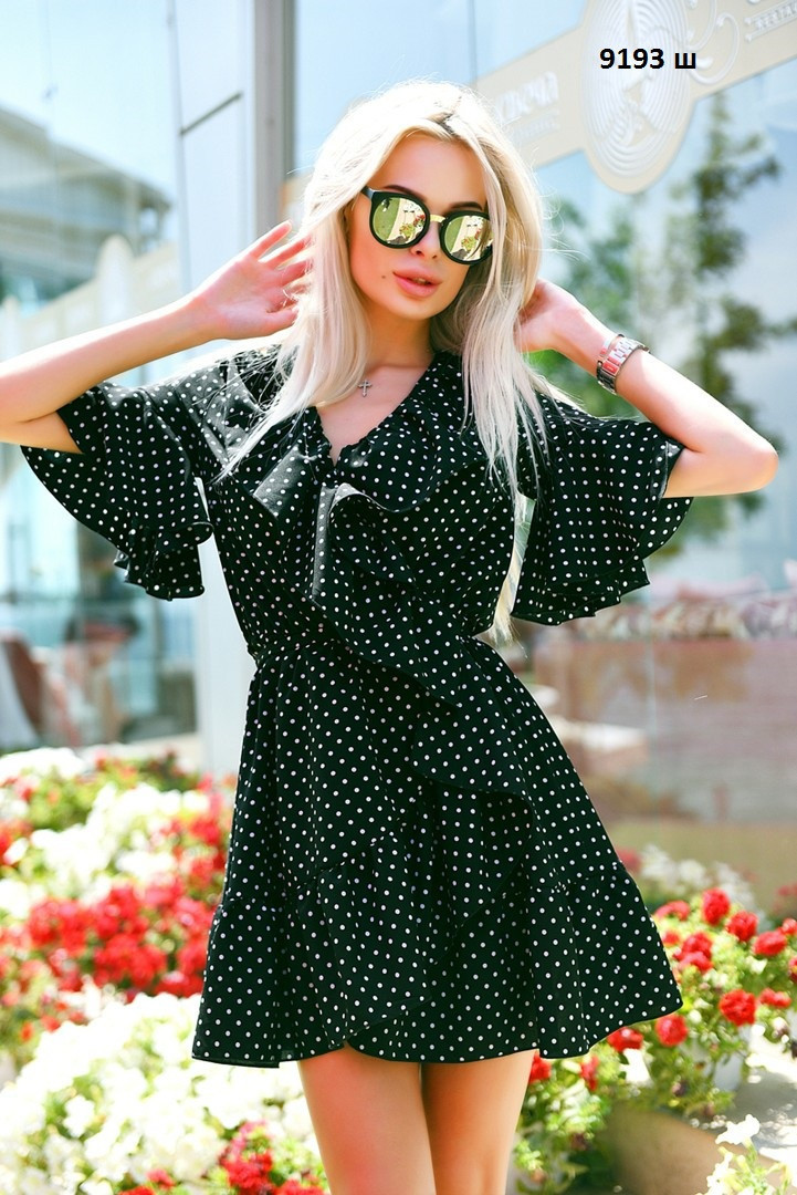 ПЛАТЬЕ ХАЛАТ РЮШ В ГОРОШЕК НА ЗАПАХ ,НА ВНУТРЕННЕЙ ЗАВЯЗКЕ И ВНЕШНИМ ПОЯСКОМ,