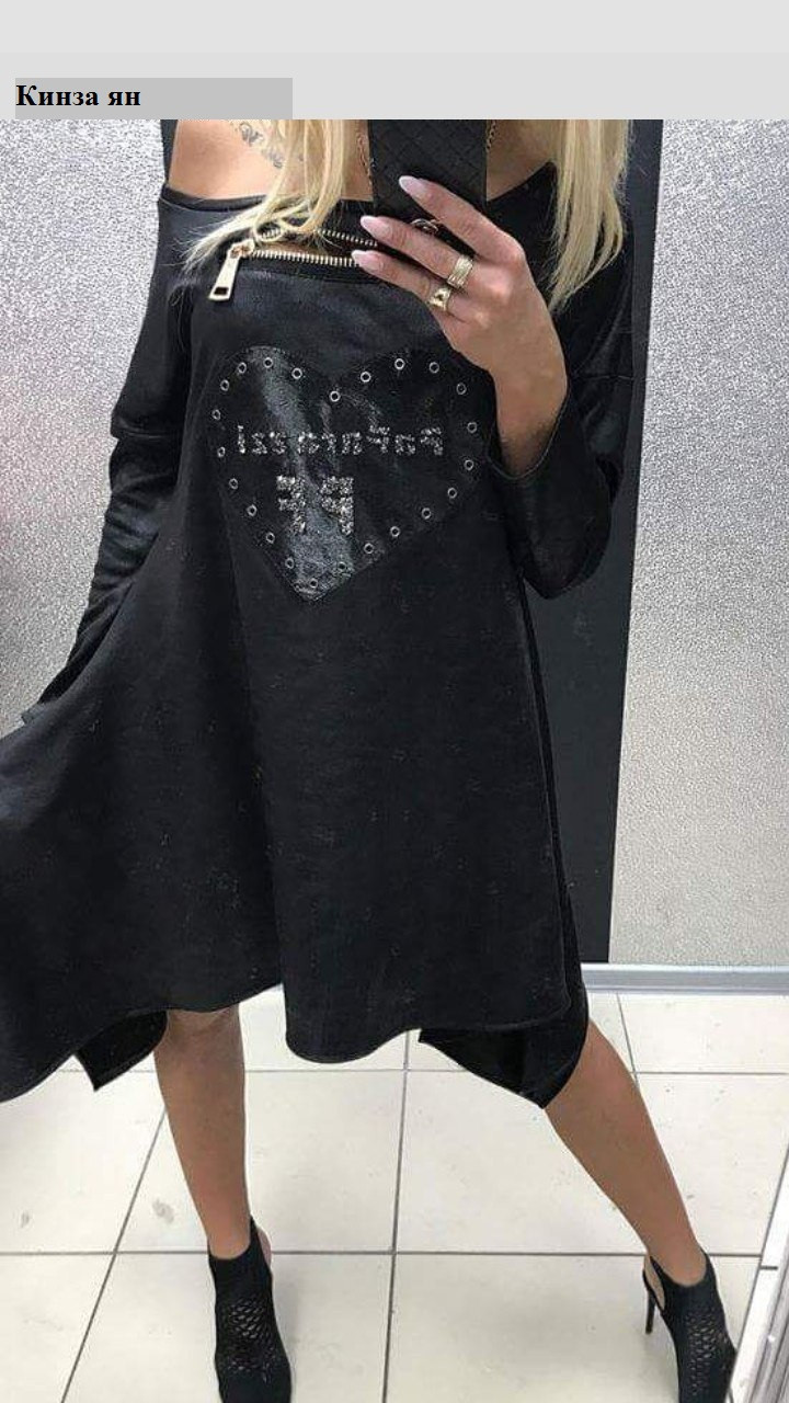 Женское платье на одно плечо Французский трикотаж Нашивка "сердечко", змейка Платье с карманами Цвет - Черный норма - с-м, м-л батал 48-50, 52-54