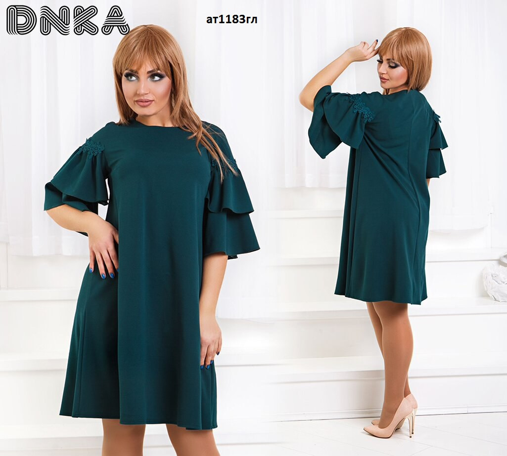 Платье батал ат1183гл Размеры: 50. 52. 54. 56 Ткань: креп дайвинг На рукаве кружево Цвет: зеленый, бордо, черный