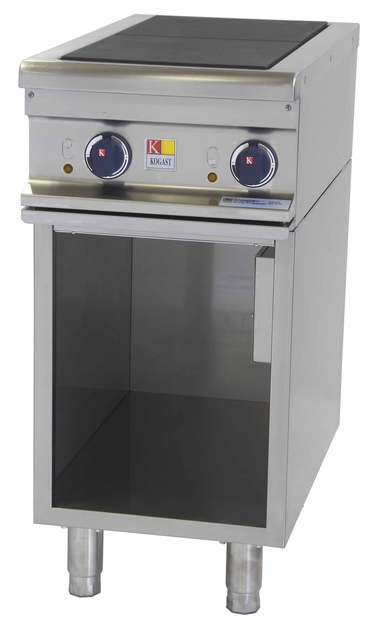 2-х конфорочная напольная электрическая плита Kogast ЕS-T27/Р с квадратными чугунными конфорками размером 300х300 мм. Поверхность плиты ровная, что позволяет удобно передвигать наплитную посуду.