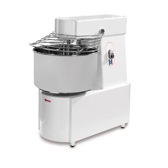 Тестомес из нерж. стали и окрашен в белый цвет. Мощный цепной привод. Дежа, защитная сетка дежи и спираль тестомеса из нерж.стали AISI 304. Для безопасного использования установлено реле включения низкого напряжение 12В. Характеристики аппарата гарантируют постоянный уровень качества при работе как с большими, так и с малыми количествами теста. Несъемная дежа 450х300 мм, неподъемный рабочий мех-м, объем дежи 48л, разовая загрузка теста 43 кг, 2 скорости.