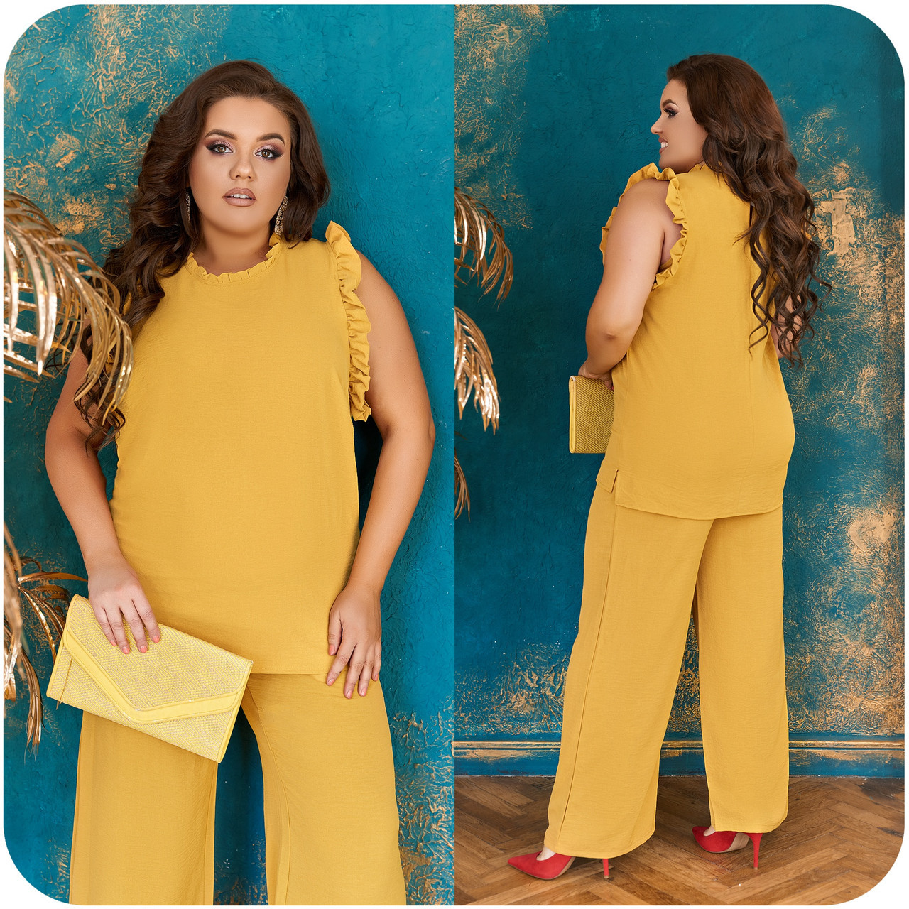 Женский красивый летний костюм из жатого льна: блузка и брюки с широкими штанинами, батал большие размеры - фото 1 - id-p10317978