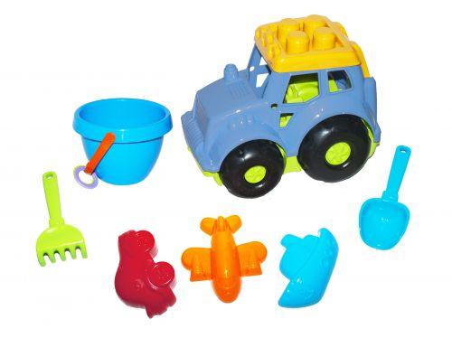 Трактор "Кузнечик №3"с песочным набором. Набор включает в себя: трактор, ведро, лопатку, грабельки и 3 пасочки. С этим набором ребёнок сможет играть как дома, так и на улице.