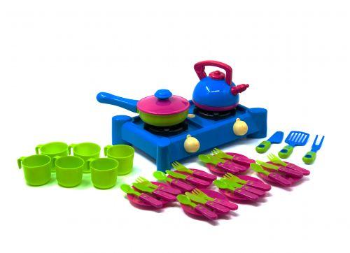 Комплектация: Плита, чайник, сковородка, 3 лопатки, 6 чашек, 6 тарелок, 6 ложек, 6 вилок, 6 ложек