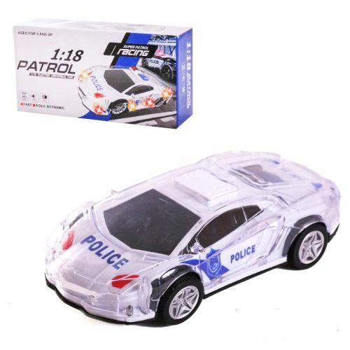 Пластиковая полицейская машина. Работает на батарейках: ездит и поворачивает, ударяясь о препятствия, имеет яркую и разноцветную 3D подсветку и играет весёлую музыку. Изготовлена из качественного пластика. Масштаб: 1:18.
