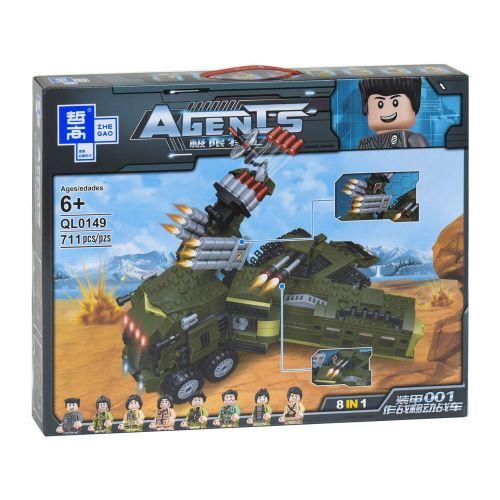 Конструктор "Agents" на 711 деталей. Можно собрать 8 разных машинок из военной техники. Выполнен из качественного пластика. Для детей от 6 лет.