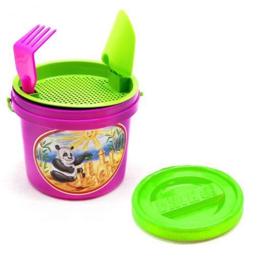 Яркий песочный набор. В комплекте: пластиковое ведёрко с красочной наклейкой и крышечкой (14 х 17 см), ситечко, лопатка и грабельки. Набор идеально подойдёт для игр в песочке.