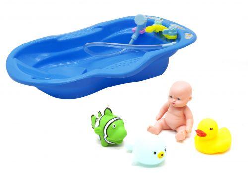 Игровой набор пупс в ванночке с рыбками. В комплекте: яркая пластиковая ванночка с краниками, резиновый пупсик (подвижный), уточка, кукла, рыбка, морской котик. Размер ванночки: 16*4,5*25 см, размер пупса: 12*5,5 см, размер животных 8-10 см.