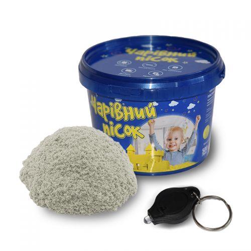Кинетического песок (0,5 кг). Такой песок прекрасно держит любую форму, быстро распадается при необходимости, а его строение отличается одновременно пористостью и прочностью. По ощущениям он напоминает сырой морской песок, только кинетический песок без воды, он не прилипает к рукам, не пачкает одежду. В наборе также есть фонарик: если посветить им на песок - тот начнёт светиться в темноте. Таким образом, на песке можно рисовать различные рисунки, писать надписи.