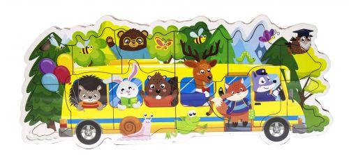 Деревянная рамка-пазл "Веселое путешествие". Рамка в форме автобуса. Также, есть 12 деталей пазла разной формы и размера. Можно собрать картинку автобуса со зверушками. Размер рамки - 30х12 см.