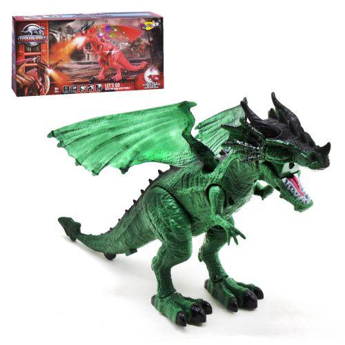 Дракон "Dinosaur World". Ходит вперед, машет крыльями, двигает шеей и головой. Главная особенность игрушки - пар. Если залить воду в голову дракона (специальная бутылочка в комплекте), то из пасти чудовища пойдет пар, а яркая подсветка будет создавать иллюзию извержения струи ледяного воздуха. Игрушка сделана из нетоксичного пластика. Длинна дракона 31 см.