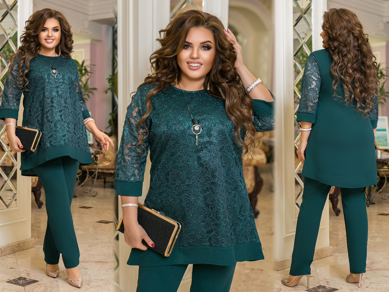 Женский нарядный костюм: свободная блуза-туника с блестящим гипюром и брюки классика, батал большие размеры - фото 1 - id-p10425082