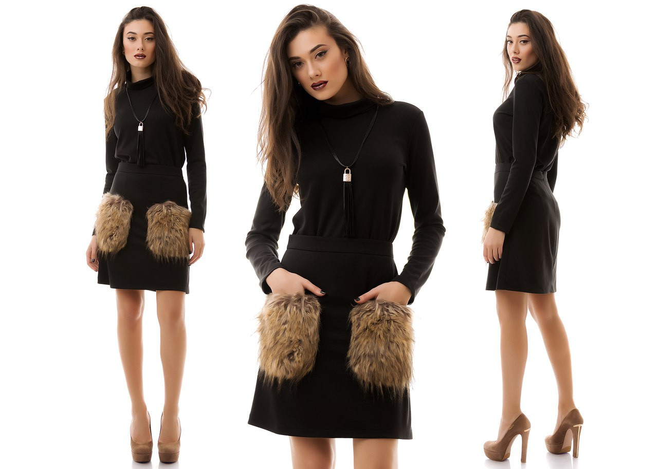Практичный повседневный теплый костюм юбка с меховыми карманами и водолазка - фото 1 - id-p10442695