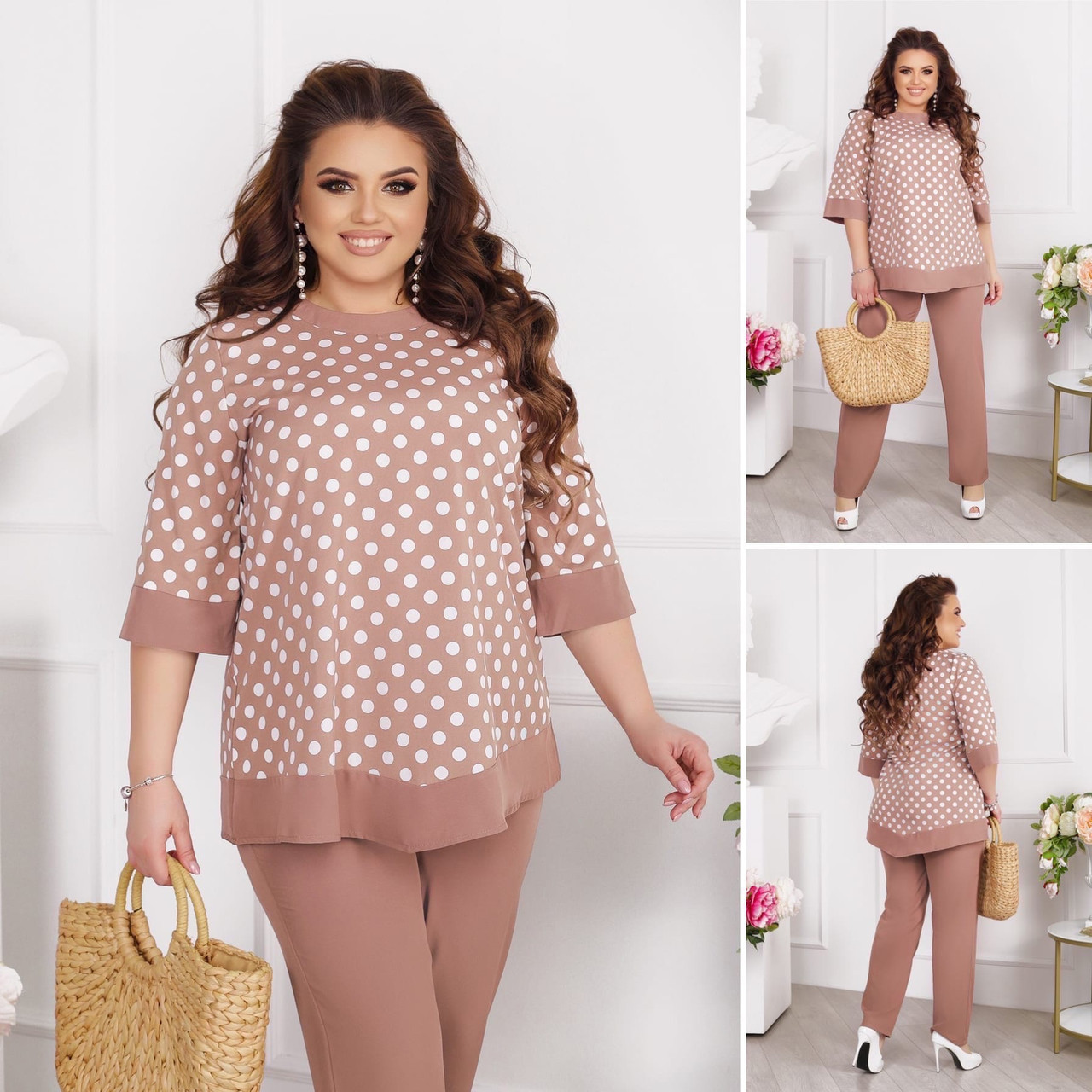 Женский деловой костюм брюки однотон и блуза в горох, батал большие размеры - фото 1 - id-p10487352