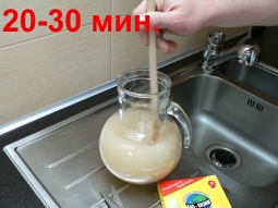 Содержимое пакета растворить в 2 литрах теплой воды (30-40°С) , и в течение примерно 20 - 30 мин. время от времени помешивать. После этого раствор вылить в канализацию. При непроходимости канализационных труб необходимо, прежде всего, прочистить трубу механическим способом (хотя бы немного) чтобы препарат проник и работал по всей длине загрязненной канализационной системы. Необходимо чтобы препарат работал в трубах как минимум 8 часов (смотри дополнительные предостережения п.п.2 и 3). 100г препарата необходимо на одно ответвление канализации.
