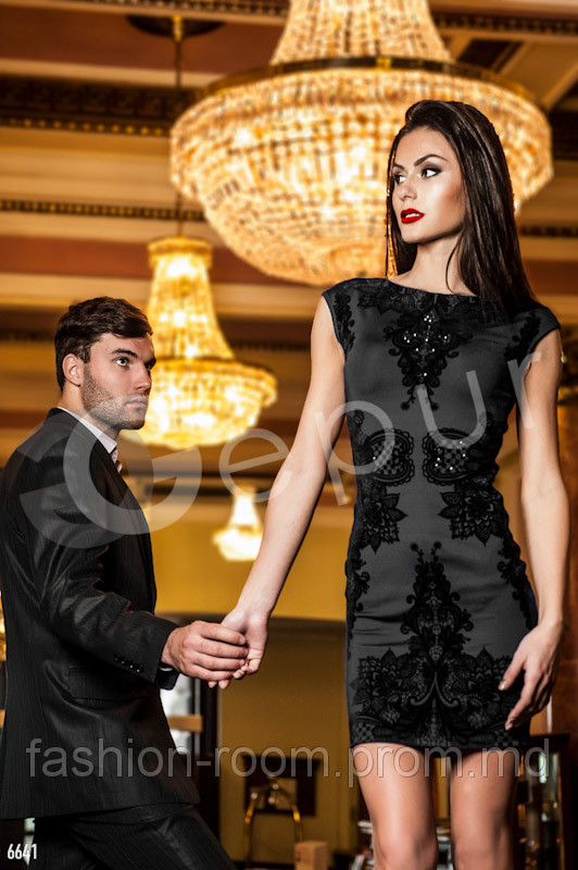 Платье коктельное, декорированное бархатным кружевом и камнями