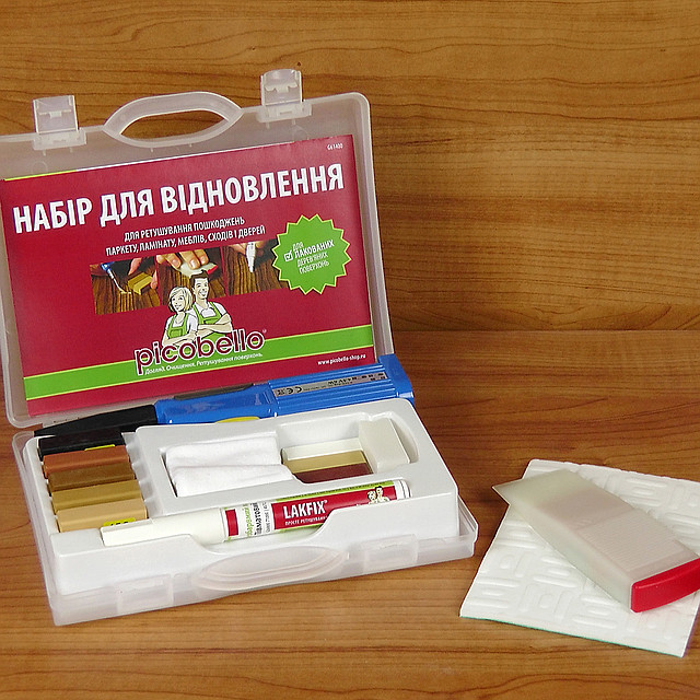 Оптимальний набір для ремонту подряпин, невеликих отворів, вм'ятин і пошкоджених країв. Використовувати для паркету, ламінату, високоякісних меблів, а також для сходів, дверей і кухонних фасадів. Засіб містить твердий віск як наповнювач (різних відтінків деревини), а також всі необхідні допоміжні засоби. Для герметизації і захисту відновлюваного місця застосовують Pinsel-Fix-Klarlack (прозорий фіксуючий лак з пензликом) як олівець-коректор.