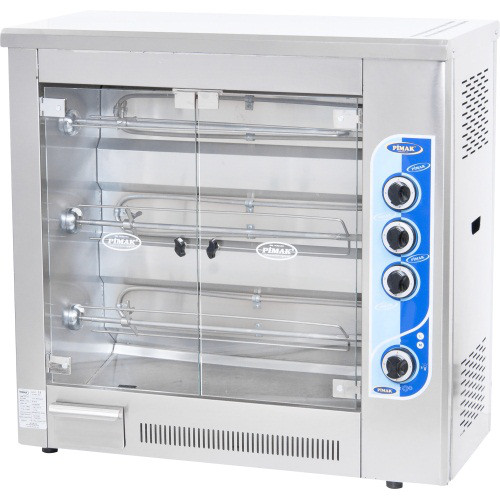Производитель: Pimak,Турция. Процесс жарки легко регулируется с помощью простой панели управления. Все модели имеют встроенную подсветку, регулятор температуры, поддон для сбора жира. Тены расположены сверху, задняя стенка стеклянная. Мощность: 3,5кВт. Потребление газа: 320гр/ч. Размеры, мм: 900х500х700