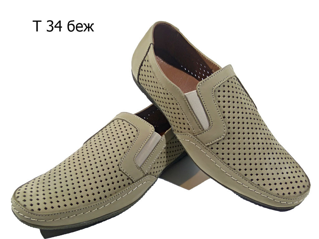 Мокасины летние мужские натуральная перфорированная кожа на резинке бежевые (Т34) 40 - фото 1 - id-p7811595