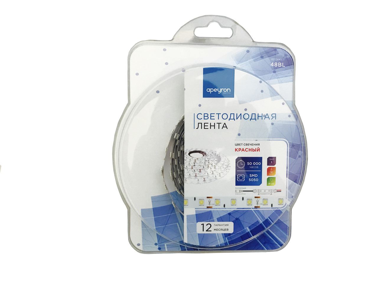 Светодиодная лента в блистере предназначена для акцентной подсветки потолков и предметов интерьера (различных ниш и полок). Лента имеет длину 5 метров. Степень защиты IP20 не позволяет использовать изделие в помещениях с высоким уровнем влажности. Цвет свечения – красный.