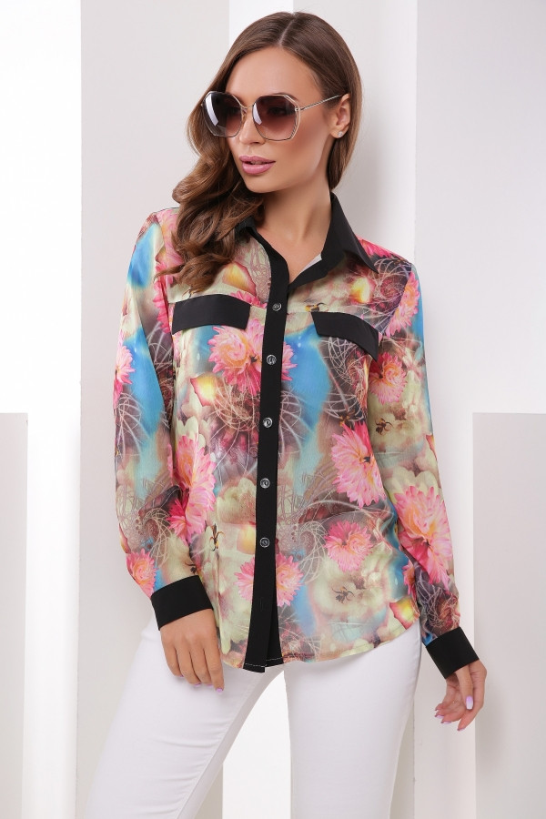 Женская блуза в рубашечном стиле, выполнена из легкой и приятной ткани шифон, манжеты и воротник выполнены из ткани софт. Втачной рукав с манжетом на пуговице, отложной воротник на стойке, застежка пуговицы. Отличный выбор для уверенных в себе леди.