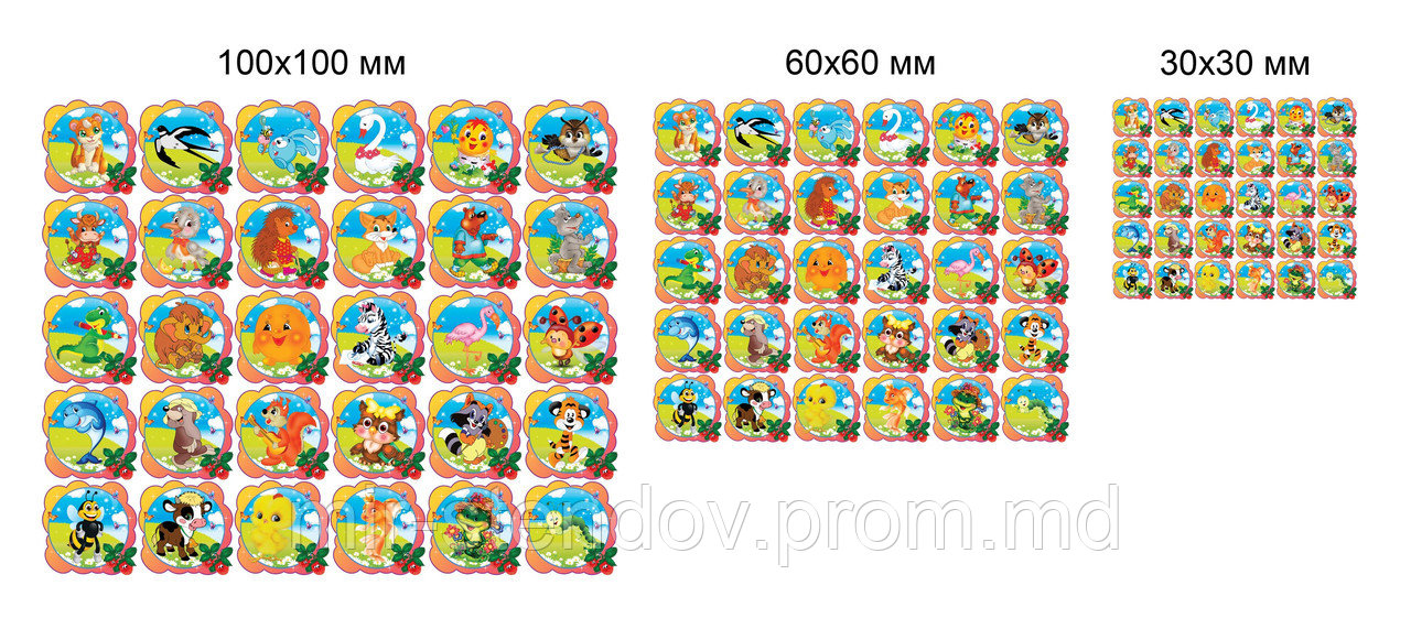 30 наклеек размером 3х3 см.