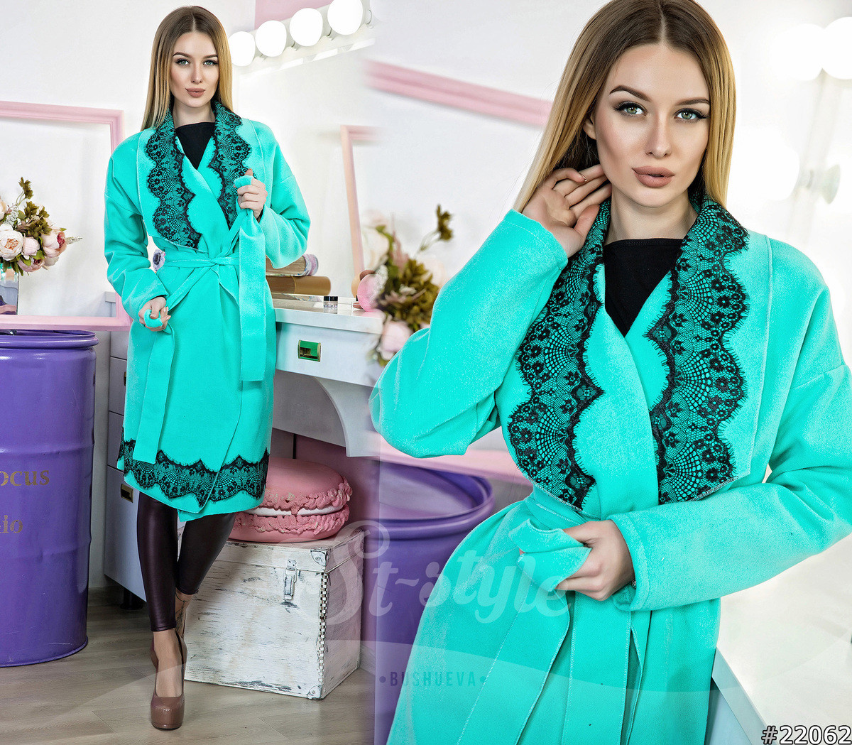 Материал: кашемир, без подкладки, присутствуют боковые карманы. Длина изделия: 98 см, рукава от основания шеи 73см. Элегантное пальто-халат с кружевными вставками, в различных цветовых решениях. Изделие выполнено в бутылочный, бордовый, персик, мята, т-синий. цветах. Пальто свободного кроя, с широкими рукавами и стильным, однобортным, широким воротом. За счет черных кружевных вставок на воротнике и по линии низа, пальто выглядит очень женственно и привлекательно. Не смотря на то, что пальто свободного кроя, оно не выглядит мешковато, и благодаря поясу, который подчеркивает изящную талию, создается гармоничный силуэт.