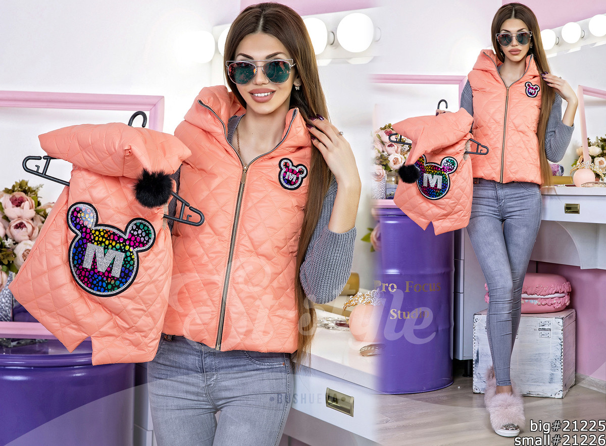 Материал: плащевка стежка + синтепон 100 , флис. Стразы на силиконе пришиты. Жилетка имеет необычный конусообразный капюшон, с милым пушистым помпоном. Спинка оформлена мультяшным персонажем Mickey Mouse. Сзади, на спинке, есть небольшой разрез, который придает непринужденный стиль повседневному образу